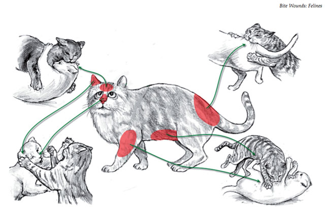 A mordida do gato apresenta uma característica inerente à espécie, que gera problemas sérios. Pelo fato de serem dentes finos, eles agem como agulhas, fazendo uma ferida pequena mas profunda. A pele tende a cicatrizar rapidamente, fechando a ferida e deixando as bactérias implantadas lá no fundo terem um ambiente ótimo para crescimento, com alimento, boa temperatura e umidade. Quando a mordida se dá em regiões aonde a pele é mais solta, como pescoço, dorso, abdômen, cabeça, pode desenvolver um abcesso, observando um inchaço e, se não for cirurgicamente puncionado e drenado, ele vai formar uma fístula e drenar, e aí sim chega o proprietário em completo desespero às vias de um AVC no consultório.